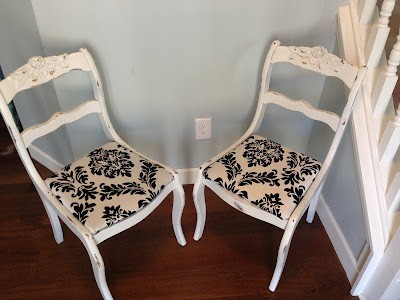 They are painted in a soft matte white chalk paint and distressed through to their gorgeous original dark wood. Upholstered in an elegant and sophisticated black and white damask... these bold contrasty chairs will fit perfectly in your home.